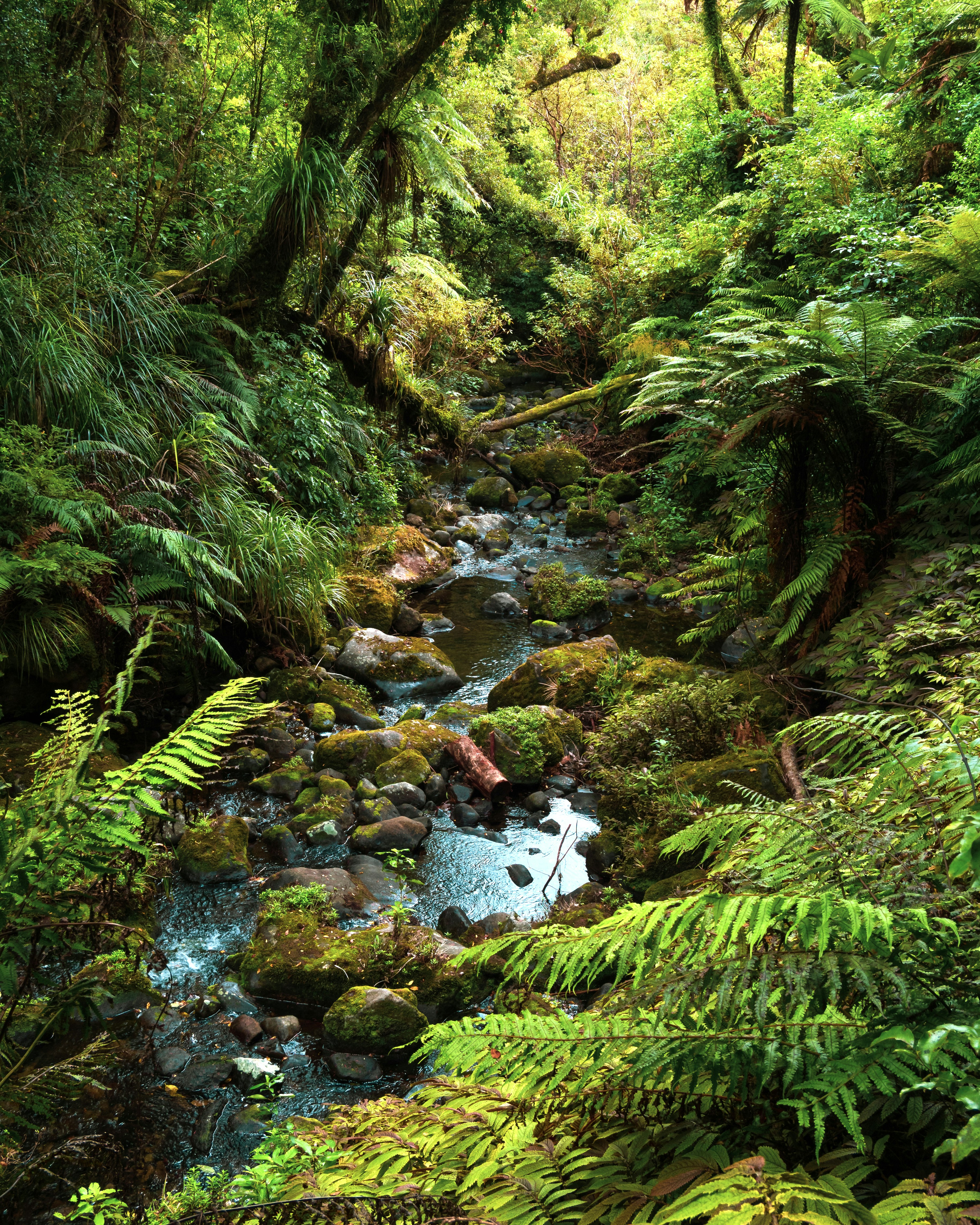 A stream running through a lush green forest