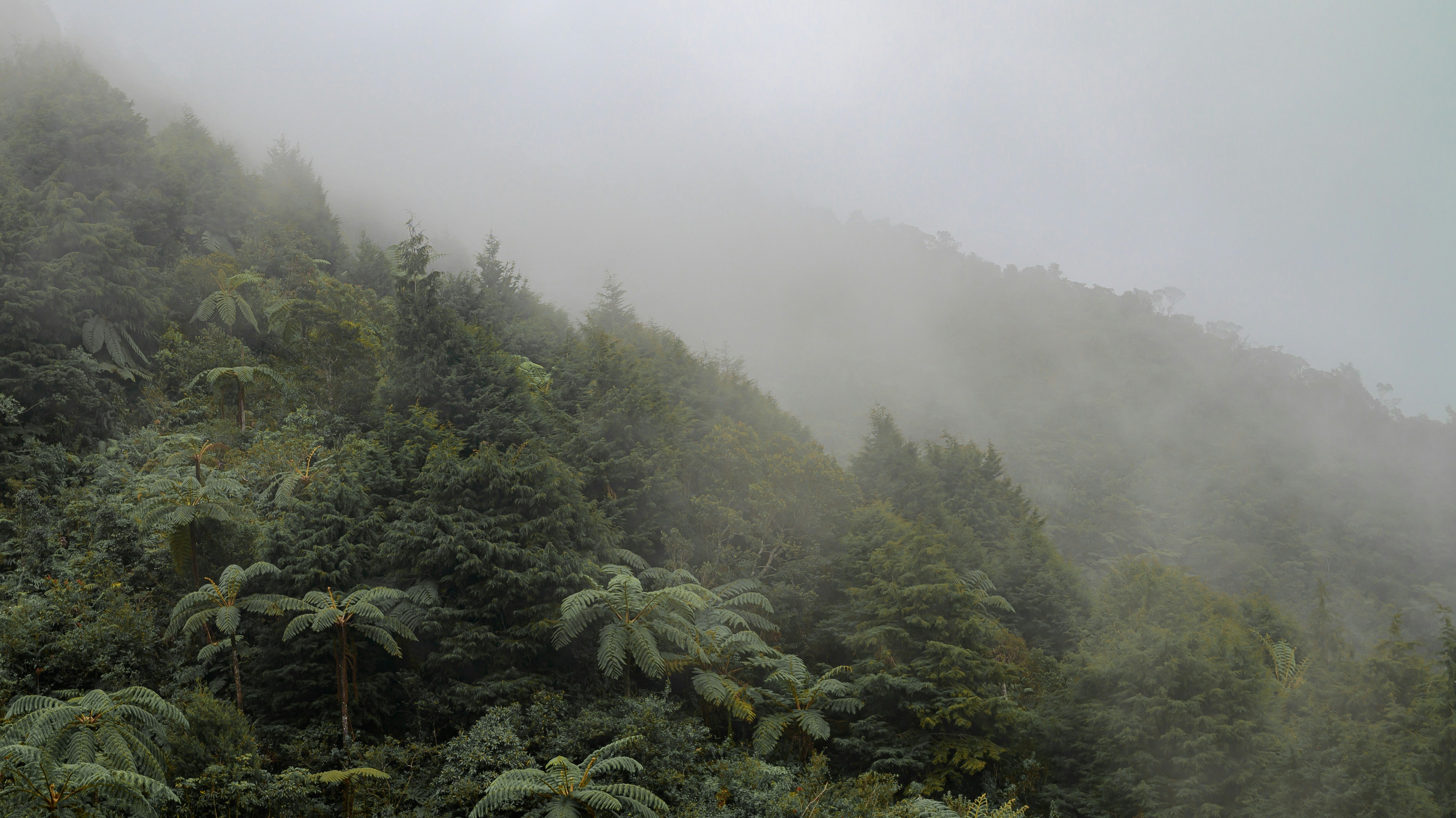 a mountain covered in fog with trees on the side