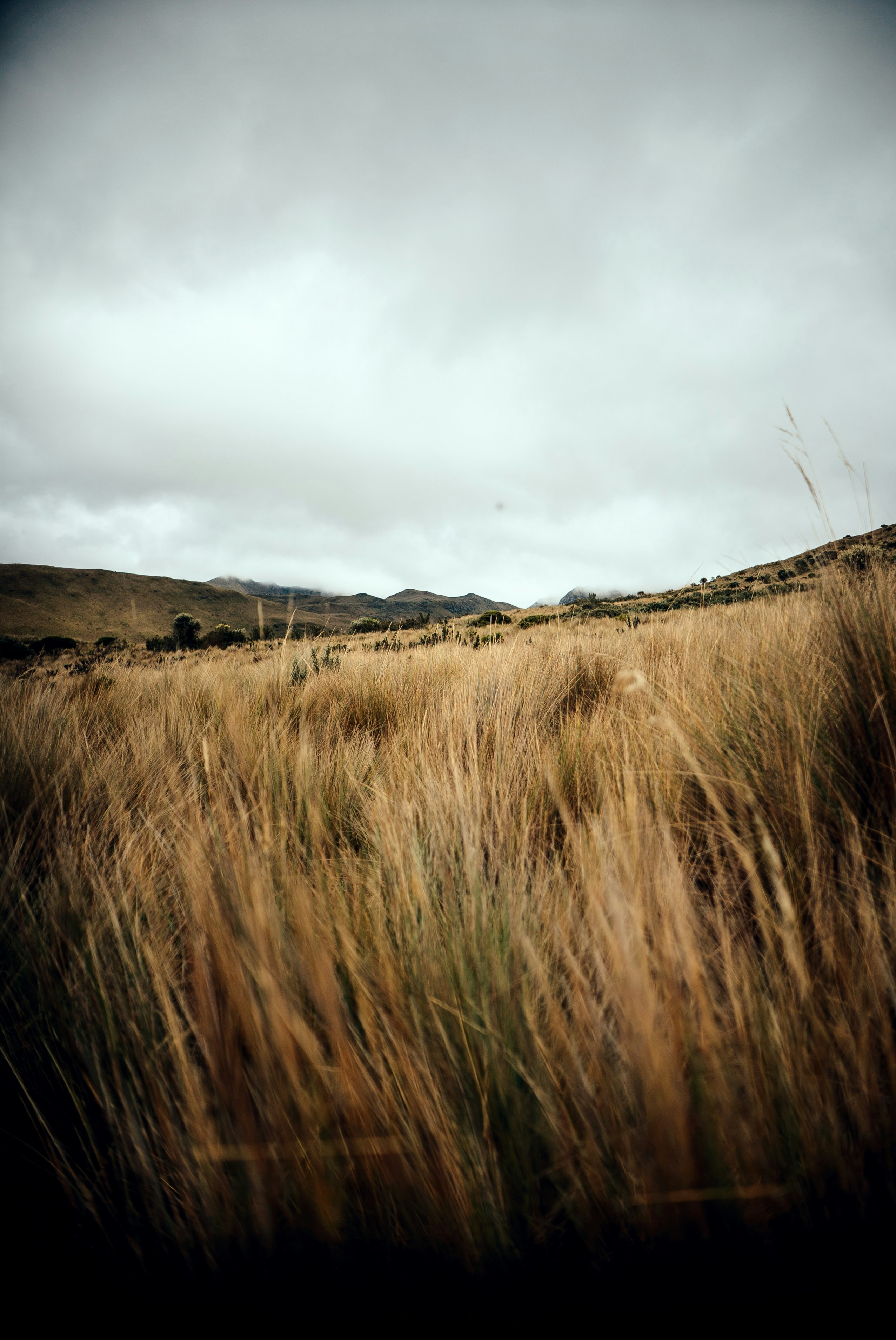 a field of tall grass with hills in the background
